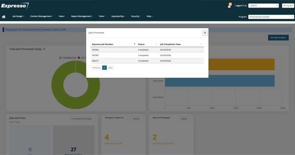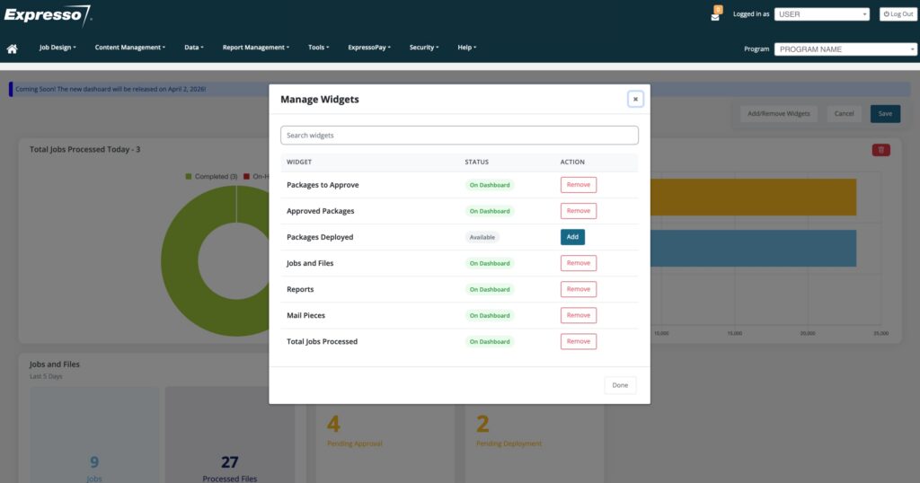 The new dashboard will be more visually appealing with improved features. The initial widgets that will be available include, Packages to Approve, Approved Packages, Packages Deployed, Jobs and Files, Reports, Mail Pieces, Total Jobs Processed.